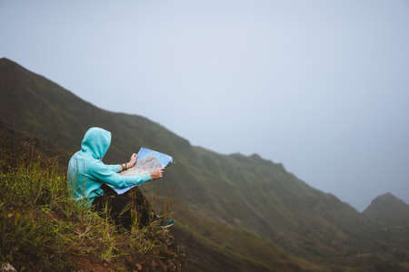 Traveler wear blue hoodie with the map sitting on the hill of a mountain in front of a gorgeous panorama view t othe valley