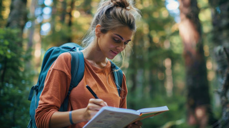 A solo traveler practicing mindfulness and journaling in a serene forest taking time to reflect and rejuvenate on their alcoholfree retreat