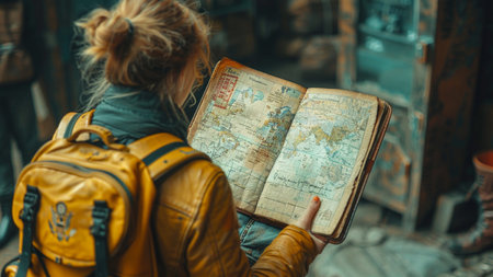 Dynamic image of a traveler exploring a world map filled with different objects, awakening wanderlust. Generative AI