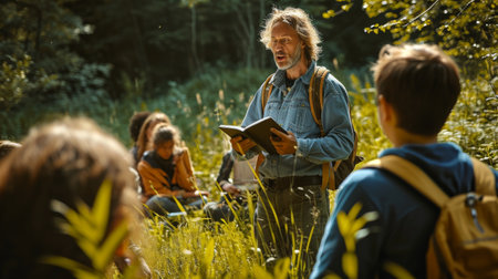 Park ranger educating kids about nature conservation against deforestation. Environmental awareness and education.