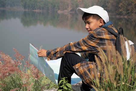Young Asian man sitting on the river bank and looking at map.