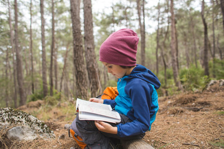 A child is exploring the forest, a boy is looking for a location on a map, a hike in the mountains with children.