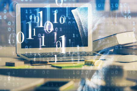 Double exposure of creative abstract binary code hologram on laptop background. Database and programming concept