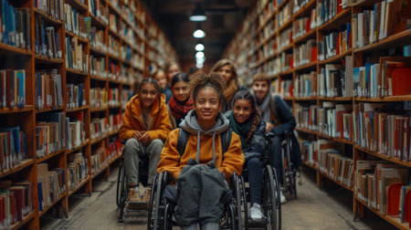 Heartwarming portrait of five diverse schoolmates in a library, showcasing joy and inclusivity. Students of different backgrounds sharing a moment of friendship and learning.