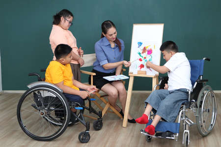 A group of young girls with disabilities and autism is training their hand and finger muscles by drawing and painting with water. With the help of teachers Happy and focused in the classroom
