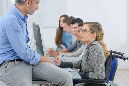 Inclusion, disability, woman man girl boy people working, wheelchair, inclusive employment, business happy cheerful cute smiling job, diversity, profession, support help cooperation