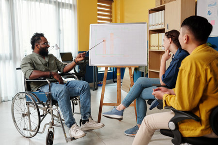 African Businesswoman with disability pointing at flipchart and presenting her business strategy at meeting at office
