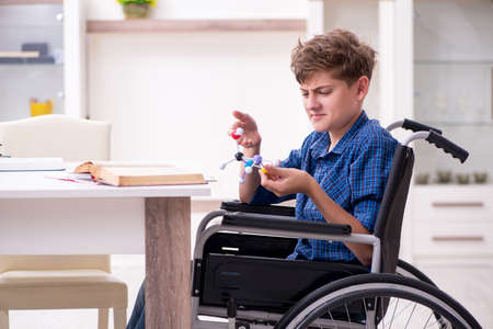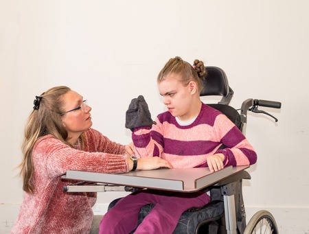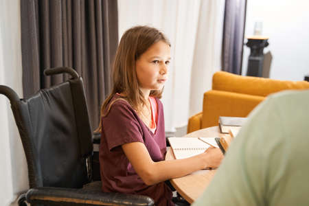 young girl on wheelchair is practicing writing and learning with toys at home to develop her skills.