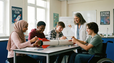 Students engage in a rocket building activity in a classroom. They collaborate on a project, drawing and decorating a model rocket. A teacher guides them during the process.