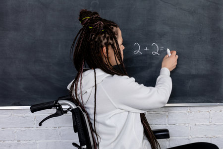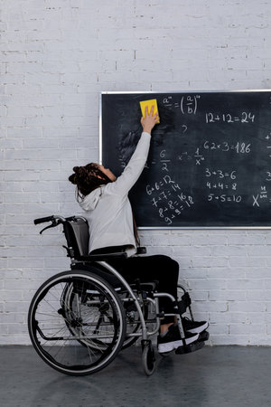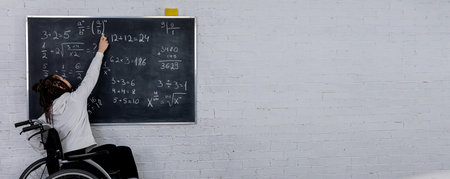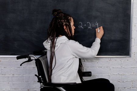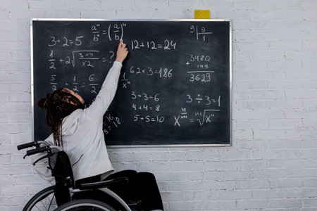 A dedicated teacher in a wheelchair inspires students while skillfully writing on a chalkboard