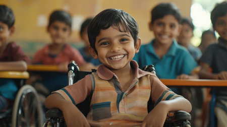 A joyful young boy in a wheelchair smiles brightly in a lively classroom setting, surrounded by classmates, highlighting the importance of inclusion and happiness in education.