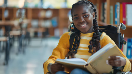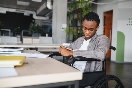 Young black man in a wheelchair, reading a book and studying in a bright, modern office, focusing on education and personal growth