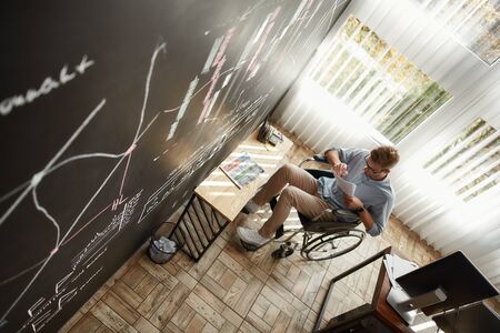 Top view of busy young male trader in a wheelchair analyzing some documents while sitting near blackboard in the modern office