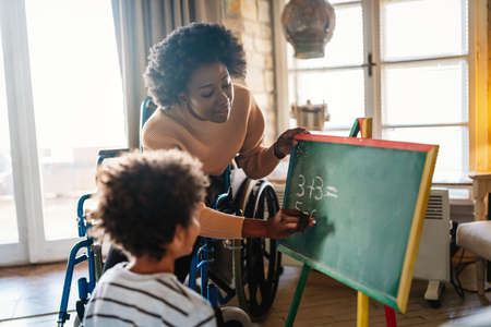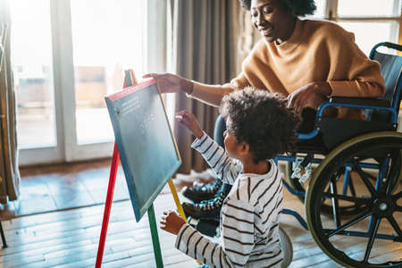 Caucasian man sitting in wheelchair in living room and holding son on knees while helping with homework. Responsible dad with special needs explaining education assignment for child at home.