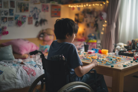 A child in a wheelchair plays a board game in a brightly decorated bedroom showing inclusion and childhood joy.