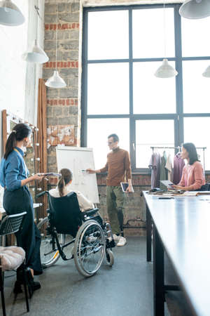 Young disable male designer pointing at whiteboard while pointing out his view of new collection