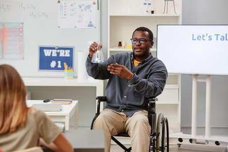 Portrait of African American teacher in wheelchair holding glass beaker during chemistry class in school