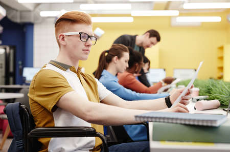 Vibrant side view portrait of red haired young man with disability studying in college, copy space