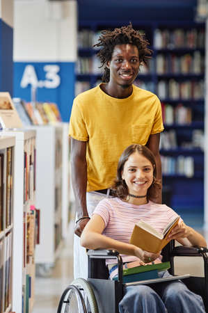 Vertical portrait of smiling young woman with disability looking at camera in college library with friend assisting