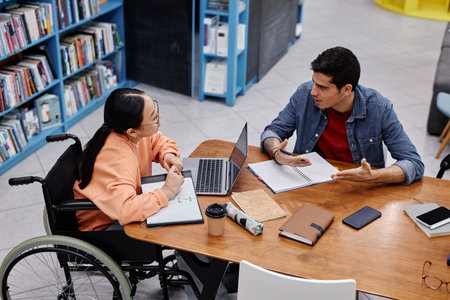 High angle portrait of Asian teenage girl with disability talking to friend in college library while studying together