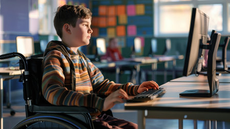 A boy in a wheelchair is typing on a computer. The boy is wearing a striped sweater and is looking at the computer screen. The room is filled with desks and chairs