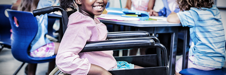 Smiling biracial elementary schoolgirl sitting on wheelchair at desk in classroom. unaltered, education, childhood, learning, disability, physical disability and school concept.