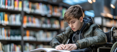 Holding yellow folder and red notebook, boy in wheelchair studying at school library, copy space. Collaboration, education, diversity, accessibility, digital learning, teamwork, academic