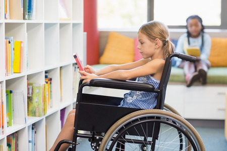 African american elementary schoolboy using digital tablet while sitting on wheelchair in corridor. unaltered, education, physical disability, wireless technology and school concept.