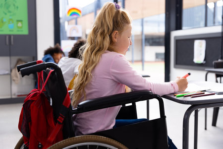 Caucasian schoolgirl in wheelchair with diverse schoolchildren in school classroom. Education, inclusivity, elementary school, learning and disability concept.