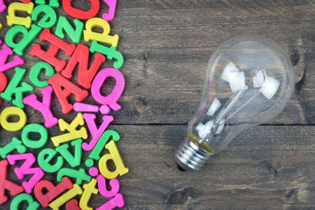 Lightbulb and letters as an idea for backing that cheekbones. School education minimal concept.