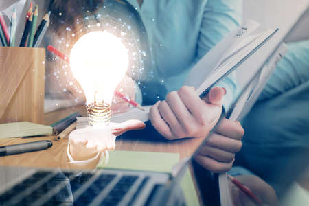Bulb hologram over hands taking notes background. Concept of idea. Double exposure