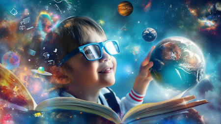 A young child with glasses touches a Earth emerging from an open book. Symbols of learning. Colorful illustration of a boy gazing at a magical galaxy. A vibrant illustration depicting a young child engrossed in reading a book.