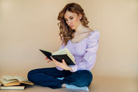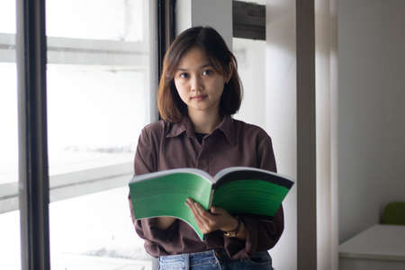 Portrait of a positive cheerful student holding a book. The teacher is preparing for the lesson. The concept of education and pleasant leisure.