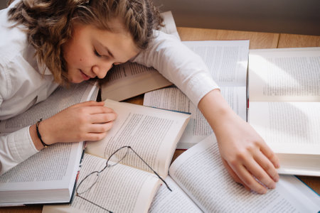 Little girl in glasses Studying Hard Exam and Sleeping on Books, Tired schoolgirl in Library