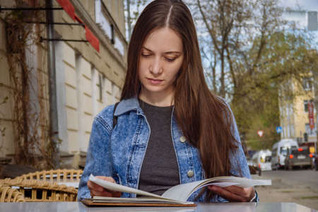 a cheerful girl in a blue denim shirt sits in a cafe and reads a book