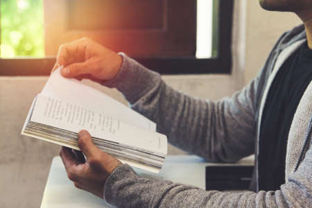 Man in black shirt and gray Hooded sweatshirt sitting reading book test on table ,Copy space for your text.Vintage tone with sunset light ,Education concept.