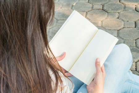 Close up of a young caucasian woman reading a book sitting in a bank on a park. Horizontal. With copy space.