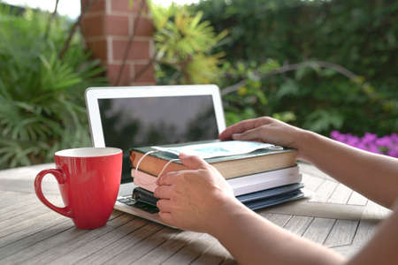 Woman hands on stacked books with face mask on top of open laptop with red cup. Study at home during pandemic concept.