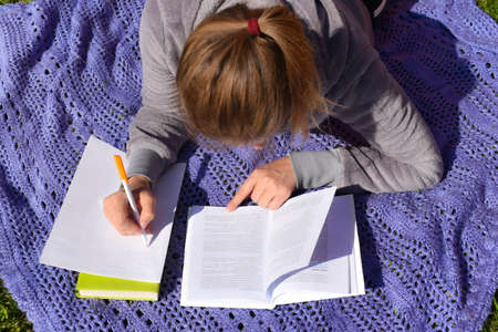 A woman writes out important notes from a textbook. student prepares for a difficult exam.