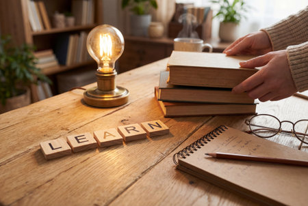 Wooden tiles spell learn on a desk while hands stack books beside a glowing vintage lightbulb, reading glasses, and a notebook with pencil in a cozy study room.