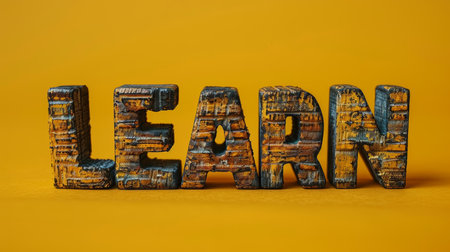Rustic textured wooden letters form the word 'LEARN' against a vibrant yellow backdrop, depicting concepts of education and creativity.