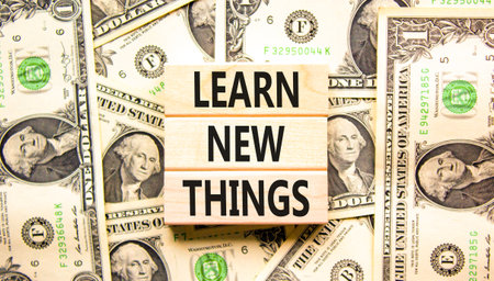 Learn new things symbol. Concept words Learn new things on beautiful wooden blocks. Dollar bills. Beautiful background from dollar bills. Business motivational learn new things concept. Copy space.