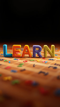 Colorful letters of the word learn surrounded by scattered alphabet blocks on a wooden surface