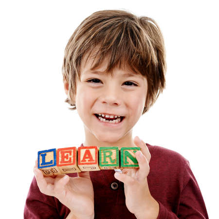 Play is the highest form of learning. Studio shot of a cute little boy holding building blocks that spell the world learn against a white background.