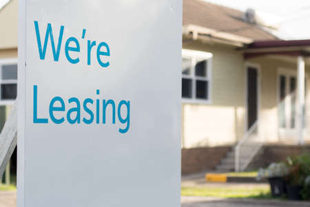 For lease sign on a white display outside of a resedential building house in Australia. Investment property real estate concept