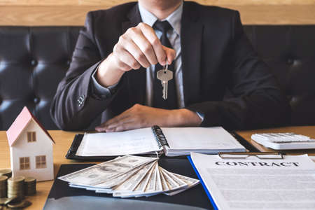 Estate agent giving house keys to client after signing agreement contract real estate with approved mortgage application form, concerning mortgage loan offer for and house insurance.