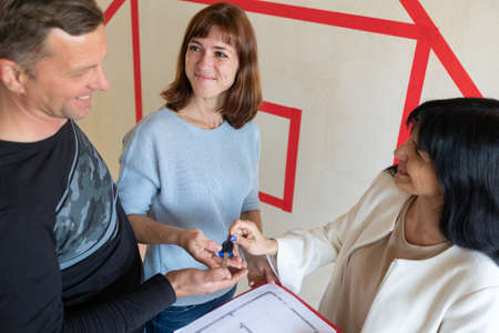 Real estate agent hands keys to new apartment to young emotional couple. Concept new homes, new beginning. High quality photo