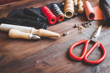Cobbler work desk. Tools and leather at cobbler workplace. Set of leather craft tools on wooden background.