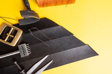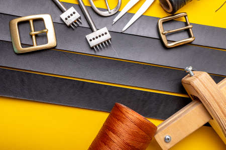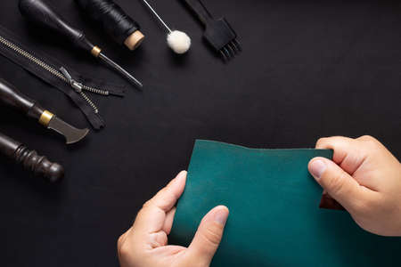 Leather craftsmanshiip with handmade tool object on leather working bckground