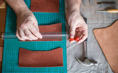 Close-up photo the hands of a skilled shoemaker make a bag from a piece of genuine leather.